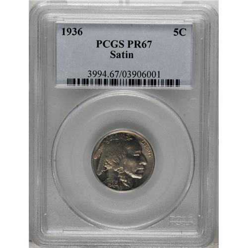 <B>1936 5C Type One--Satin Finish PR67 PCGS.</B></I> Collectors differ in their opinion regarding the desirability of the two different types of 1936 proof nickels. The satin finish proof is related to the earlier matte proofs of the 1913 to 1916 period, while the brilliant finish proof is related to the later 1937 issue. Both varieties are important and deserve their place in an advanced collection. This Superb Gem has wispy gold color over lustrous nickel-gray surfaces.<BR><BR><b>Shipping:</b> Coins & Currency (<a target="_blank" href="http://www.heritageauctions.com/common/shipping.php">view shipping information</a>)