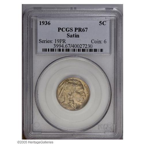 <B>1936<5C> Type One--Satin Finish PR67 PCGS.</B></I> Extraordinary striking details characterize this Satin Finish variant from 1936. As one would expect from a coin at the PR67 level, there are no obvious or distracting blemishes on either side of this Superb coin. Pale golden toning covers each side except for a dash of lilac in the center of the reverse.