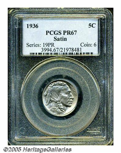 <B>1936<5C> Type One--Satin Finish PR67 PCGS.</B></I> The sharpness of strike and satiny luster are the hallmarks of this Superb Gem Satin Proof example. After a long intermission of two decades, satin proof cents and nickels were produced, similar to the earlier matte proof coinage. Later in the same year, these denominations appeared in a brilliant format, similar to the silver Proofs that were then being produced. This example has highly lustrous nickel-gray surfaces with hints of pale gold toning. It is a splendid example that will enhance any cabinet. Population: 197 in 67, 25 finer (5/05).