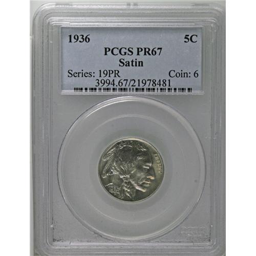 <B>1936<5C> Type One--Satin Finish PR67 PCGS.</B></I> The sharpness of strike and satiny luster are the hallmarks of this Superb Gem. After a long intermission of two decades, proof cents and nickels were produced once again--first with a satin finish and later with the deeply mirrored finish seen prior to the production of matte proofs. This example has highly lustrous lilac-tinted surfaces with hints of pale gold toning. Splendid overall and visually appealing.