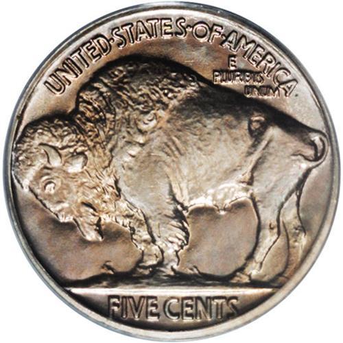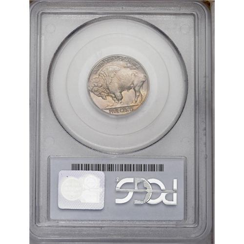 <B>1936<5C> Type One--Satin Finish PR67 PCGS.</B></I> When proof coinage resumed in 1936, the first cents and nickels produced had a satiny finish. This was distinctly different from the previous matte and brilliant finishes, but it was a short-lived experiment. Like the matte finish coins from the teens, these piece showed extraordinary striking details--details that can only be seen on a proof. The overall finish is satiny with modest reflectivity seen in the fields. This piece shows the often-seen golden and lilac toning seen on nickel products, and there are no obvious surface distractions apparent.