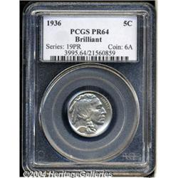 <B>1936<5C> Type Two--Brilliant Finish PR64 PCGS.</B></I> The obverse is brilliant and nearly untoned, while the reverse brilliance bursts through a subtle film of sky-blue, light-gold, and pale-lavender toning. No significant abrasions or spotting are readily apparent on the well preserved surfaces of this attractive proof Buffalo nickel.<BR><I>From The Barry Donnell Collection.</B></I> <BR><BR><B>Important notice:</B> Heritage usually auctions material at the rate of 200-250 lots per hour. On some occasions eBay Live bid software or the Internet may not be able to keep up with the pace of the auction. We recommend placing a realistic absentee bid now as insurance to avoid disappointment. Occasionally the auctioneer may eliminate or reject an eBay Live bid, and the auctioneer may also reopen a lot after the close of the eBay live bidding (usually because we missed an audience bid), and may reject your bid even if it shows you as the winning bidder. By bidding via eBay Live, you agree that Heritage may award the lot to another bidder at its sole discretion under the circumstances described above or any other reasonable circumstances. Since eBay bids are not shown to us until we open the lot on the floor, we treat those bids just like floor bids. In most cases the floor responds before the eBay bid is presented to us, due to Internet lag time, so for consistency we have made it a policy that floor bids are always considered first over tie eBay live bids. Also please note that all Heritage lots purchased through eBay Live carry a 20% Buyer's Premium. Please make sure you read the Terms and Conditions before you bid.