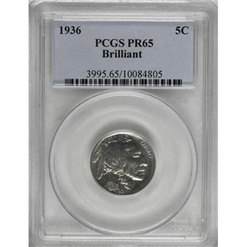 <B>1936 5C Type Two--Brilliant Finish PR65 PCGS.</B></I> Delicate sky-blue and canary-gold patina enriches the gleaming surfaces of this Buffalo Gem. After the Mint's earlier satiny finish did not satisfy collectors, it returned to the brilliant finish characteristic of 19th century proofs, a decision that met with enthusiasm.<BR><BR><b>Shipping:</b> Coins & Currency (<a target="_blank" href="http://www.heritageauctions.com/common/shipping.php">view shipping information</a>)