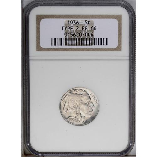 <B>1936<5C> Type Two--Brilliant Finish PR66 NGC.</B></I> A remarkable example for its brilliant light gray color, deeply mirrored fields, and faint cameo contrast. This lovely Premium Gem exhibits the sharp strike always associated with the proof Buffalo nickels.
