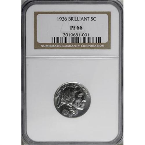 <B>1936 5C Type Two--Brilliant Finish--PR66 NGC.</B></I> Unlike the Satin Finish proofs of this year, this piece has surfaces that are uniformly reflective and deeply mirrored. This example has a fully brilliant appearance on both sides. Sharply struck, well preserved, and nearly pristine. The U.S. Mint resumed striking proof coinage in 1936, after a twenty-year hiatus. <BR><BR><b>Shipping:</b> Coins & Currency (<a target="_blank" href="http://www.heritageauctions.com/common/shipping.php">view shipping information</a>)
