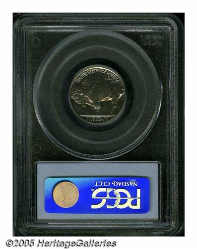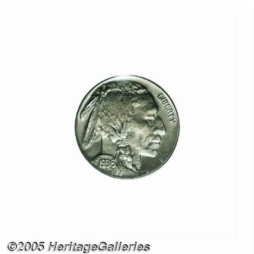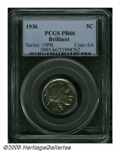 <B>1936<5C> Type Two--Brilliant Finish PR66 PCGS.</B></I> Beautiful orange and sky-blue colors bathe this meticulously struck and gorgeously preserved premium Gem. Only a couple of pinpoint carbon flecks deny perfection. Brilliant Finish proof Buffalo Nickels were only struck in 1936 and 1937, no proofs were struck in 1938 although Denver Mint business strikes with that date are plentiful.<BR><I>Ex: Auction '84 (Paramount, 7/84), lot 609.</B></I>