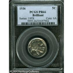 1936 5C Type Two--Brilliant Finish PR66 PCGS. Incr <B>1936 5C Type Two--Brilliant Finish PR66 PCGS.</B></I> Incredibly brilliant, with dazzling, essentially untoned mirrors. Surprisingly, the brilliant finish has proven to be rarer in the highest grades than the satin finish proofs, perhaps because the brilliant versions have a tendency to accentuate any defects that might be present. <BR><BR><B>Important notice:</B> Heritage usually auctions material at the rate of 200-250 lots per hour. On some occasions eBay Live bid software or the Internet may not be able to keep up with the pace of the auction. We recommend placing a realistic absentee bid now as insurance to avoid disappointment. Occasionally the auctioneer may eliminate or reject an eBay Live bid, and the auctioneer may also reopen a lot after the close of the eBay live bidding (usually because we missed an audience bid), and may reject your bid even if it shows you as the winning bidder. By bidding via eBay Live, you agree that Heritage may award the lot to another bidder at its sole discretion under the circumstances described above or any other reasonable circumstances. Since eBay bids are not shown to us until we open the lot on the floor, we treat those bids just like floor bids. In most cases the floor responds before the eBay bid is presented to us, due to Internet lag time, so for consistency we have made it a policy that floor bids are always considered first over tie eBay live bids. Also please note that all Heritage lots purchased through eBay Live carry a 20% Buyer's Premium. Please make sure you read the Terms and Conditions before you bid. This lot is being auctioned in conjunction with a live floor auction by Heritage Galleries & Auctioneers. All final auction and invoice information will be supplied by Heritage Galleries & Auctioneers, and all other information should be considered preliminary. Lot:5623