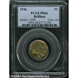 <B>1936<5C> Type Two--Brilliant Finish PR66 PCGS.</B></I> Fully mirrored throughout, the surfaces glisten with a hairline-free appearance. There is a rich overlay of "oil slick" multicolored iridescence on both sides lending a fully original appearance overall. A solidly graded premium Gem example. <BR><BR><B>Important notice:</B> Heritage usually auctions material at the rate of 200-250 lots per hour. On some occasions eBay Live bid software or the Internet may not be able to keep up with the pace of the auction. We recommend placing a realistic absentee bid now as insurance to avoid disappointment. Occasionally the auctioneer may eliminate or reject an eBay Live bid, and the auctioneer may also reopen a lot after the close of the eBay live bidding (usually because we missed an audience bid), and may reject your bid even if it shows you as the winning bidder. By bidding via eBay Live, you agree that Heritage may award the lot to another bidder at its sole discretion under the circumstances described above or any other reasonable circumstances. Since eBay bids are not shown to us until we open the lot on the floor, we treat those bids just like floor bids. In most cases the floor responds before the eBay bid is presented to us, due to Internet lag time, so for consistency we have made it a policy that floor bids are always considered first over tie eBay live bids. Also please note that all Heritage lots purchased through eBay Live carry a 20% Buyer's Premium. Please make sure you read the Terms and Conditions before you bid.