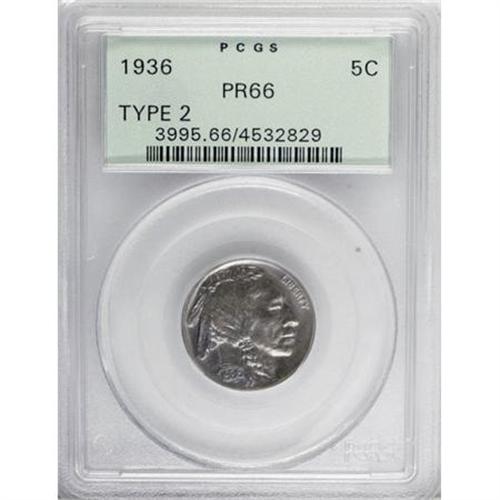 <B>1936 5C Type Two--Brilliant Finish PR66 PCGS.</B></I> According to David Lange (2000), writing about the 1936 proof nickel: "Though both the mintage and survival rate of this date greatly exceed those of all previous Buffalo nickel proofs, the demand for 1936 proofs, particularly in the brilliant finish, is tremendous." Delicate ice-blue, lilac, and beige patination adorns both sides of this Premium Gem brilliant specimen. A solid strike, befitting a proof example, leaves sharp motif detail, and close inspection reveals no significant marks or spots. Housed in a green-label holder.<BR><BR><b>Shipping:</b> Coins & Currency (<a target="_blank" href="http://www.heritageauctions.com/common/shipping.php">view shipping information</a>)