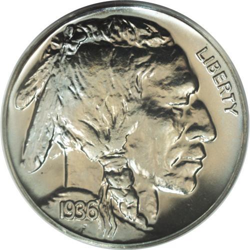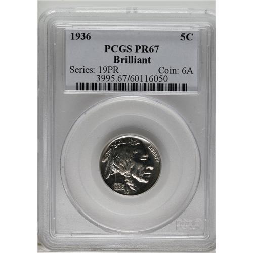 <B>1936 5C Type Two--Brilliant Finish PR67 PCGS.</B></I> David Lange, in his 2006 <I>Complete Guide to Buffalo Nickels,</B></I> wrote: "When the Mint's employees finally mastered the art of coining proofs, the pieces that resulted were of a fully brilliant finish, as on later proof coins through the 1960s." The brilliant surfaces on this Superb Gem display splashes of delicate ice-blue and champagne colors, and are immaculately preserved. A powerful strike has imparted sharp definition to the design features.<BR><BR><b>Shipping:</b> Coins & Currency (<a target="_blank" href="http://www.heritageauctions.com/common/shipping.php">view shipping information</a>)