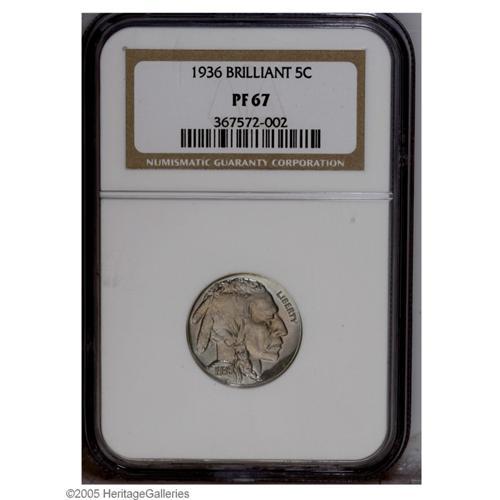 <B>1936<5C> Type Two--Brilliant Finish PR67 NGC.</B></I> Incredibly appealing, with dazzling, untoned mirrors. Surprisingly, the brilliant finish has proven to be rarer in the highest grades than the satin finish proofs, perhaps because the brilliant versions have a tendency to accentuate any defects that might be present. This Superb Gem is fully struck, and seems pristine.