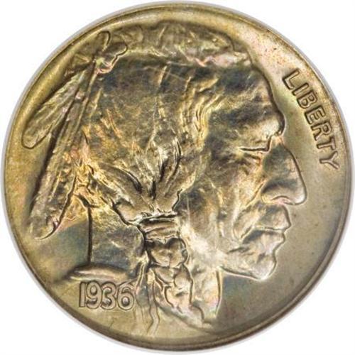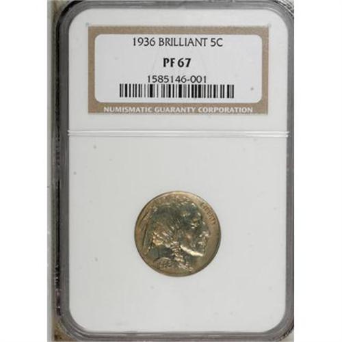 <B>1936 5C Type Two--Brilliant Finish PR67 NGC.</B></I> Fully struck with an attractive mixture of pastel colors across each side. The design features are produced with impressive sharpness, as expected for a proof specimen. Some watery reflectivity is noted in the fields. Neither side shows any evidence of contact. Interesting die lines occur along the tops and bottoms of 36 in the date, a mint-made feature also noted on one of the Satin proofs in this sale. The Brilliant Finish proofs of 1936 are much scarcer than Satin Finish coins, at the Superb Gem level of preservation. <BR><BR><b>Shipping:</b> Coins & Currency (<a target="_blank" href="http://www.heritageauctions.com/common/shipping.php">view shipping information</a>)