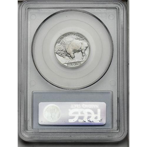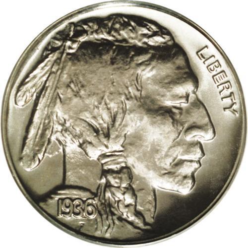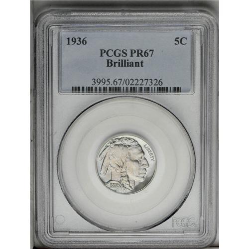 <B>1936<5C> Type Two--Brilliant Finish PR67 PCGS.</B></I> Orange and pink tints endow the centers, while the fields shimmer with ice-blue iridescence. All design elements are exactingly defined, which included the curve of the tail, the bison's hair at 9 o'clock, and the Indian's braid. The low mintage of 4,420 pieces is divided into Satin and Brilliant finishes. PCGS has certified a mere six pieces higher (5/06).