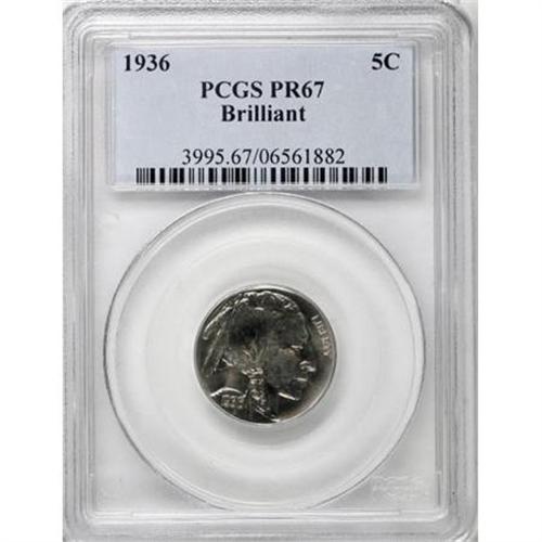 <B>1936 5C Type Two--Brilliant Finish PR67 PCGS.</B></I> The fully brilliant features of this tantalizing Type Two proof shimmer beneath delicate lilac, ice-blue, and golden-tinged iridescence. Needle-sharp striking definition, distraction-free surfaces, and captivating eye appeal combine on this delightful Superb Gem. PCGS has certified only six finer Brilliant Finish specimens (12/07).<BR><BR><b>Shipping:</b> Coins & Currency (<a target="_blank" href="http://www.heritageauctions.com/common/shipping.php">view shipping information</a>)