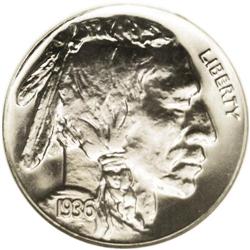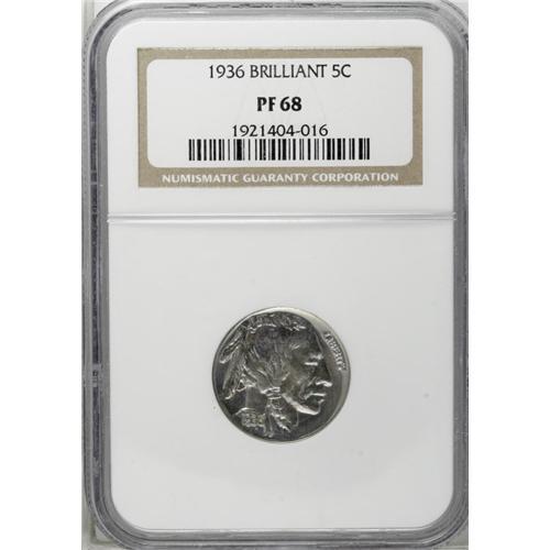 <B>1936<5C> Type Two--Brilliant Finish PR68 NGC.</B></I> The Satin Finish proofs of this issue accounted for about two-thirds of the total mintage, although the Brilliant Finish pieces were saved in greater numbers because of their higher visual appeal and popularity. This is an astonishingly gorgeous ice-blue, lilac, lemon-yellow, and silver-white example of this popular proof coin, fully struck and with absolutely pristine surfaces save for a tiny lintmark beneath the lowest feather. Population: 5 in 68, 1 finer (9/06).