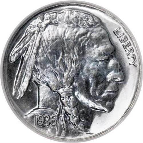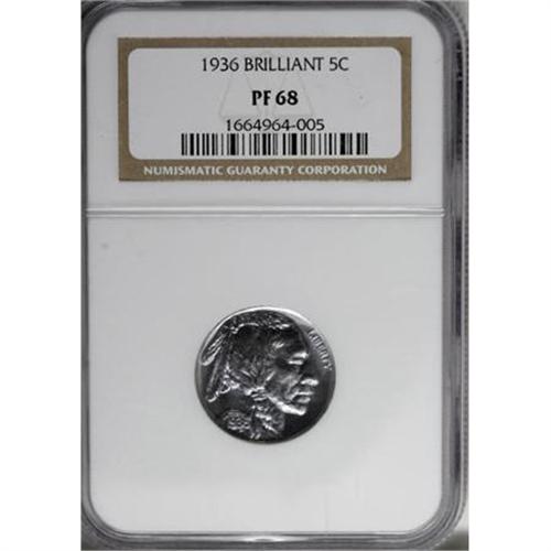 <B>1936 5C Type Two--Brilliant Finish PR68 NGC.</B></I> Ice-blue color on both sides provides a stunning visual effect. An example of the later brilliant mirrored finish. Perhaps half of the 4,420 coin mintage was produced in each style, for these coins seem to be of approximately equal rarity today. From both a visual and technical perspective, this is one of the finest 1936 Buffalo Nickels we have handled. Census: 14 in 68, 0 finer (10/07).<BR><BR><b>Shipping:</b> Coins & Currency (<a target="_blank" href="http://www.heritageauctions.com/common/shipping.php">view shipping information</a>)