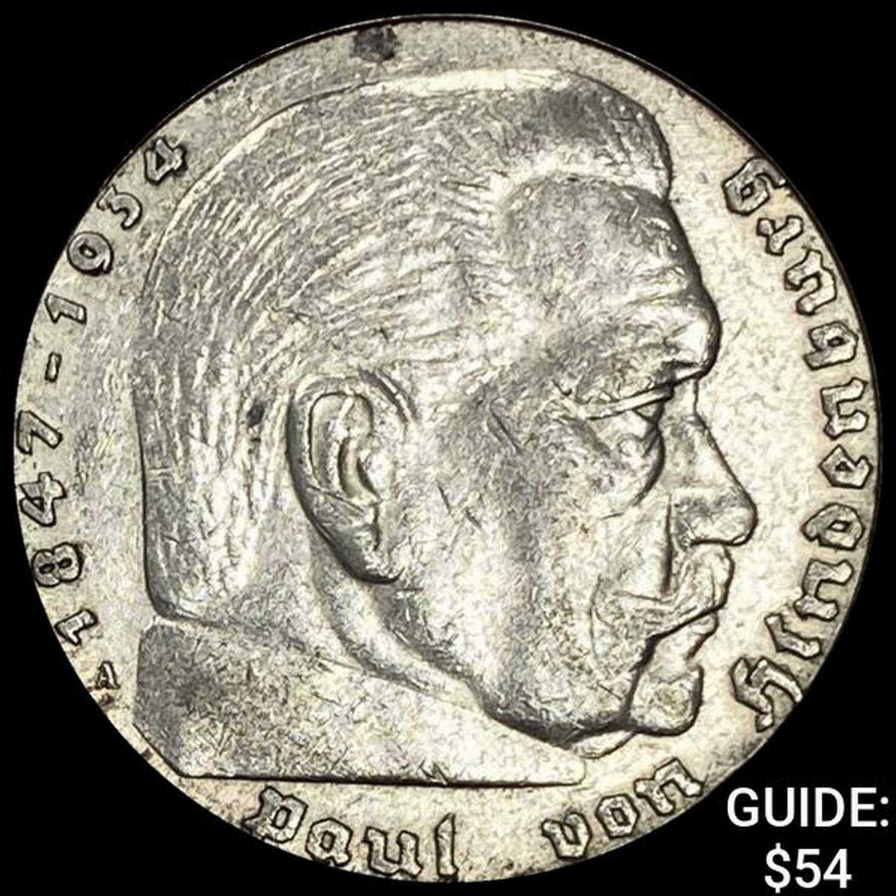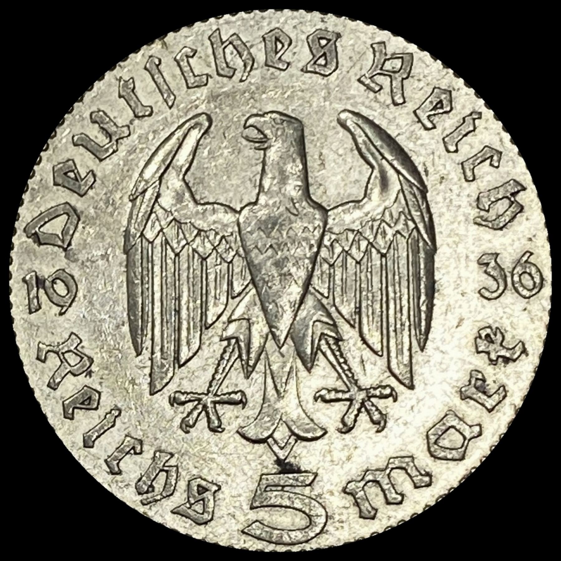 1936-A Germany Silver 5 Reichsmark CHOICE AU