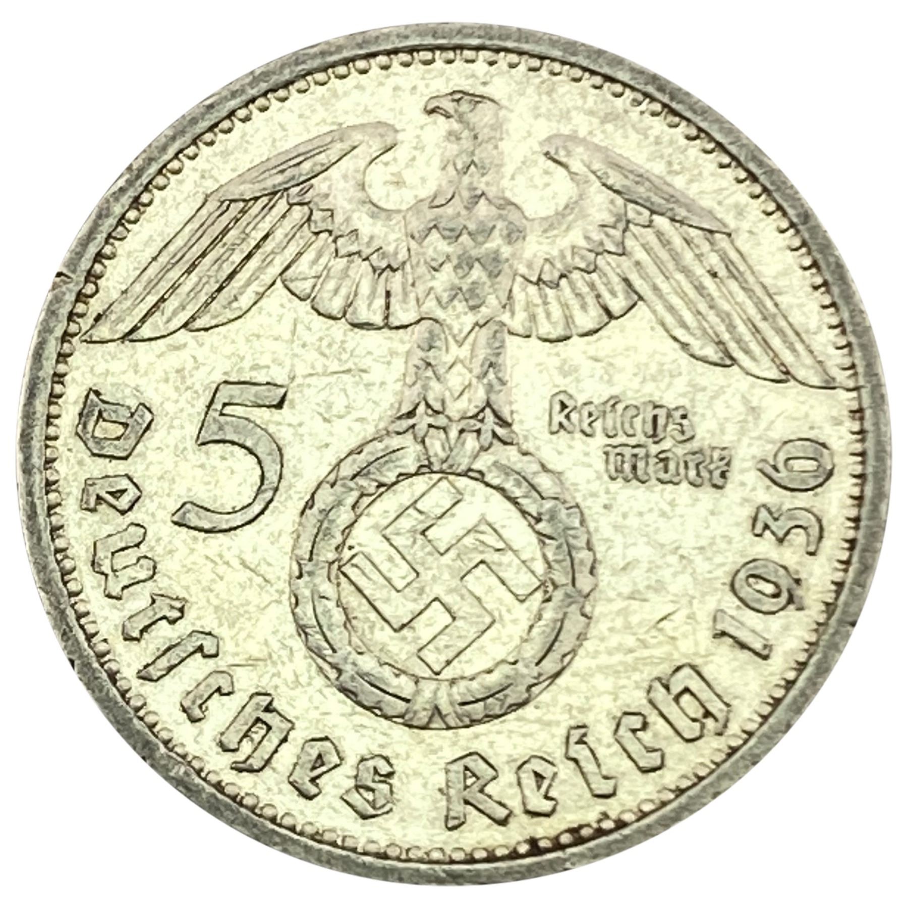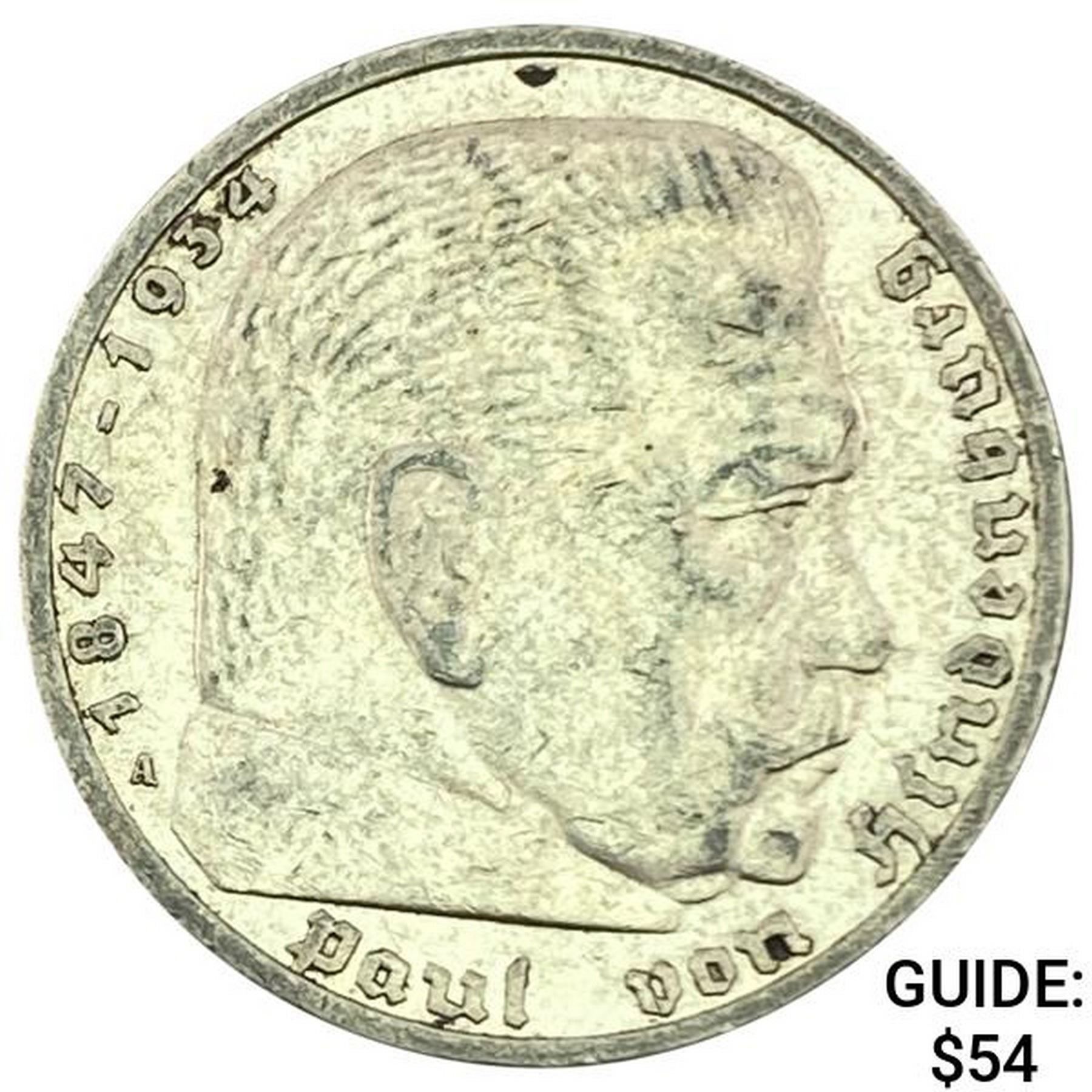 1936-A Germany Silver 5 Reichsmark CLOSELY UNCIRCULATED