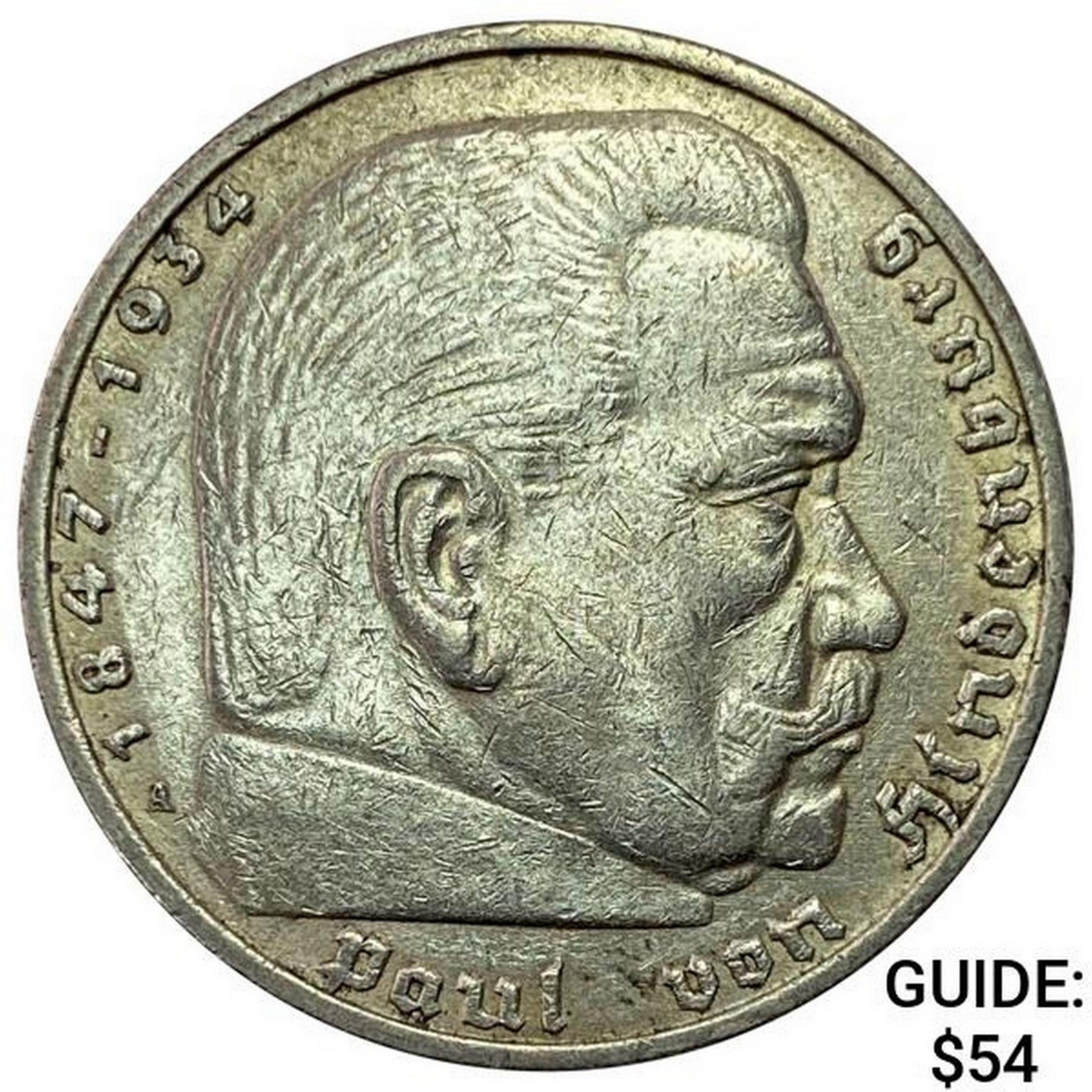 1936-A Germany Silver 5 Reichsmark CLOSELY UNCIRCULATED