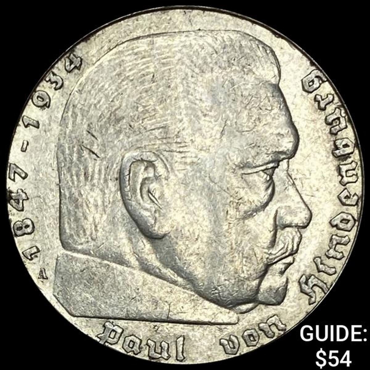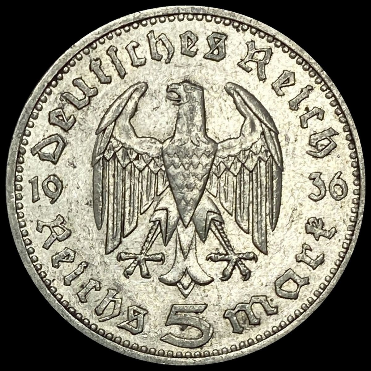 1936-A Germany Silver 5 Reichsmark CLOSELY UNCIRCULATED