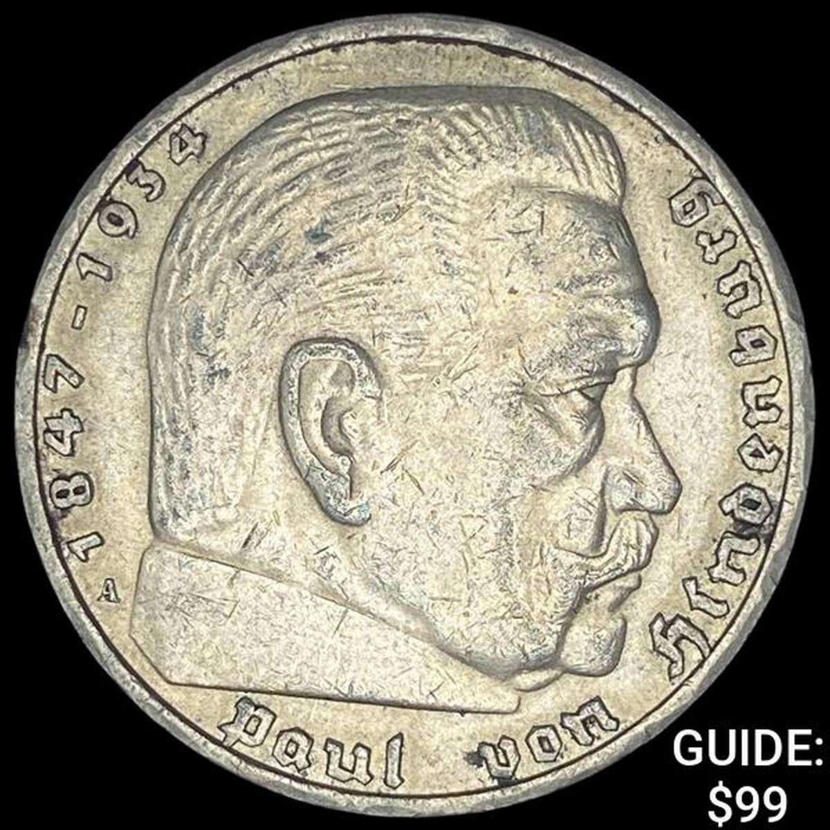 1936-A Germany Silver 5 Reichsmark CLOSELY UNCIRCULATED