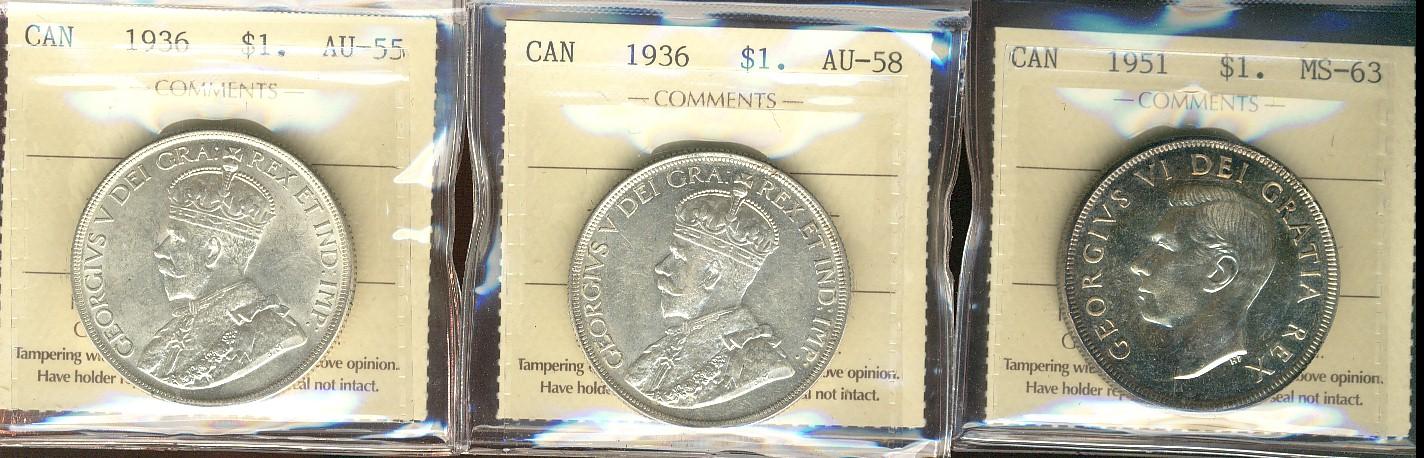 1936 AU55 & AU58, 1951 $1 MS63. Lot of 3 coins graded ICCS.