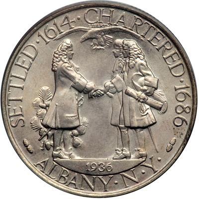 1936 Albany Half Dollar. PCGS graded MS-66. An attractive gem with eye catching mint bloom. Mintage of 17,671. Pop 712; 86 finer, 85 in 67, 1 in 68 (PCGS # 9227) .