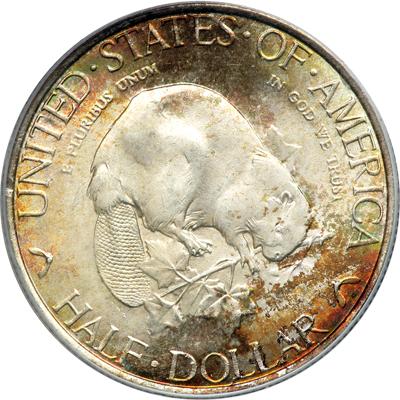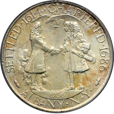 1936 Albany Half Dollar. PCGS graded MS-67. Lovely warm sunset toning on both sides. A beauty. Flat-out prestigious quality Albany Commemorative half dollar! Pop 86; 1 finer in 68. (PCGS # 9227).