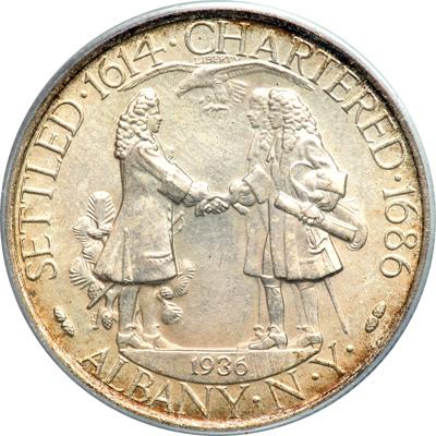1936 Albany Half Dollar. PCGS graded MS-65 PQ. Lovely golden toning graces the surface on both sides. A coin whose PQ quality is catnip to Commem buyers, we report mar-free fields and thoroughly pleasing devices plus satiny luster underneath it all (PCGS # 9227) .