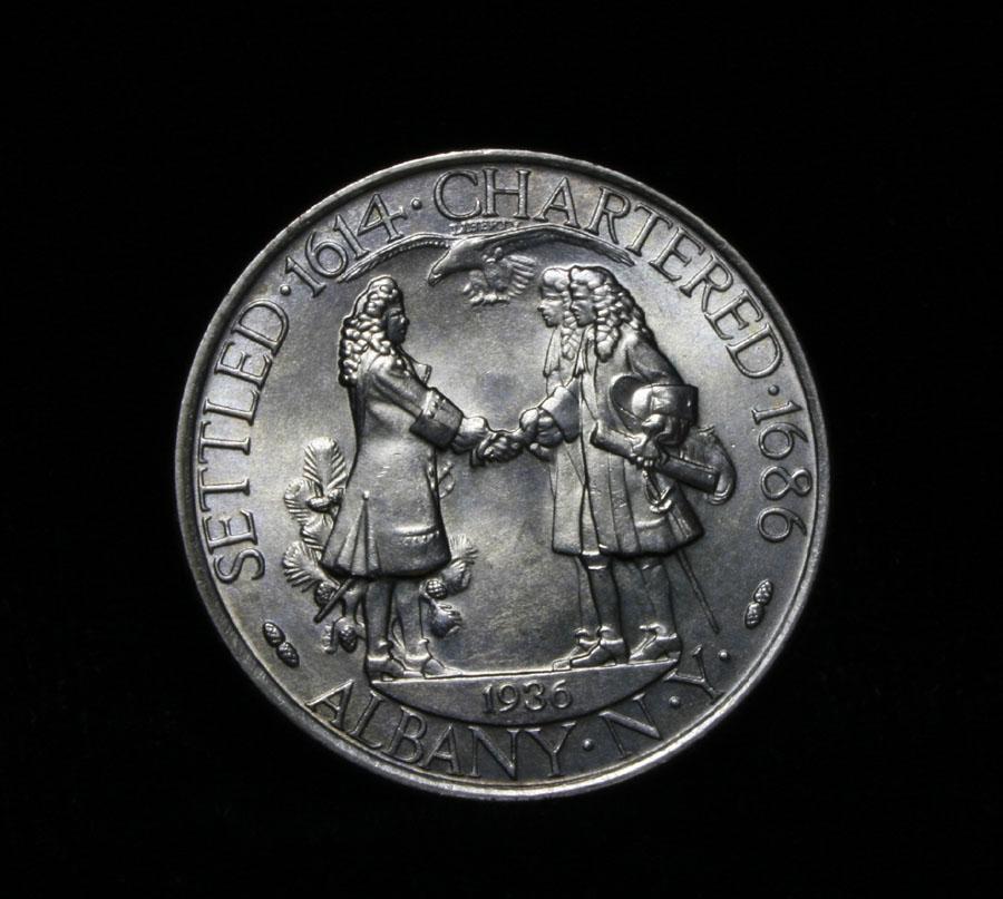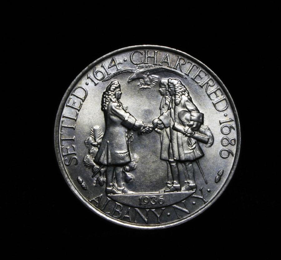 Nice White example of a very difficult Commemorative. Seldom seen this commemorative can be elusive to completing the series. Struck to commemorate the 250th Anniversary of the Charter of Albany in what was then New Amsterdam, the coin had a very local interest. When examining an Albany Charter look for signs of wear on the beaver’s hip and on Governor Dongan’s sleeve. Coin World's Coin Values lists ms65 at $410 and The Wholesale Greysheet lists ms65 at $350. (Note in the Greysheet xf is $230, this coin is rare in ANY grade!) Estimated Value $400