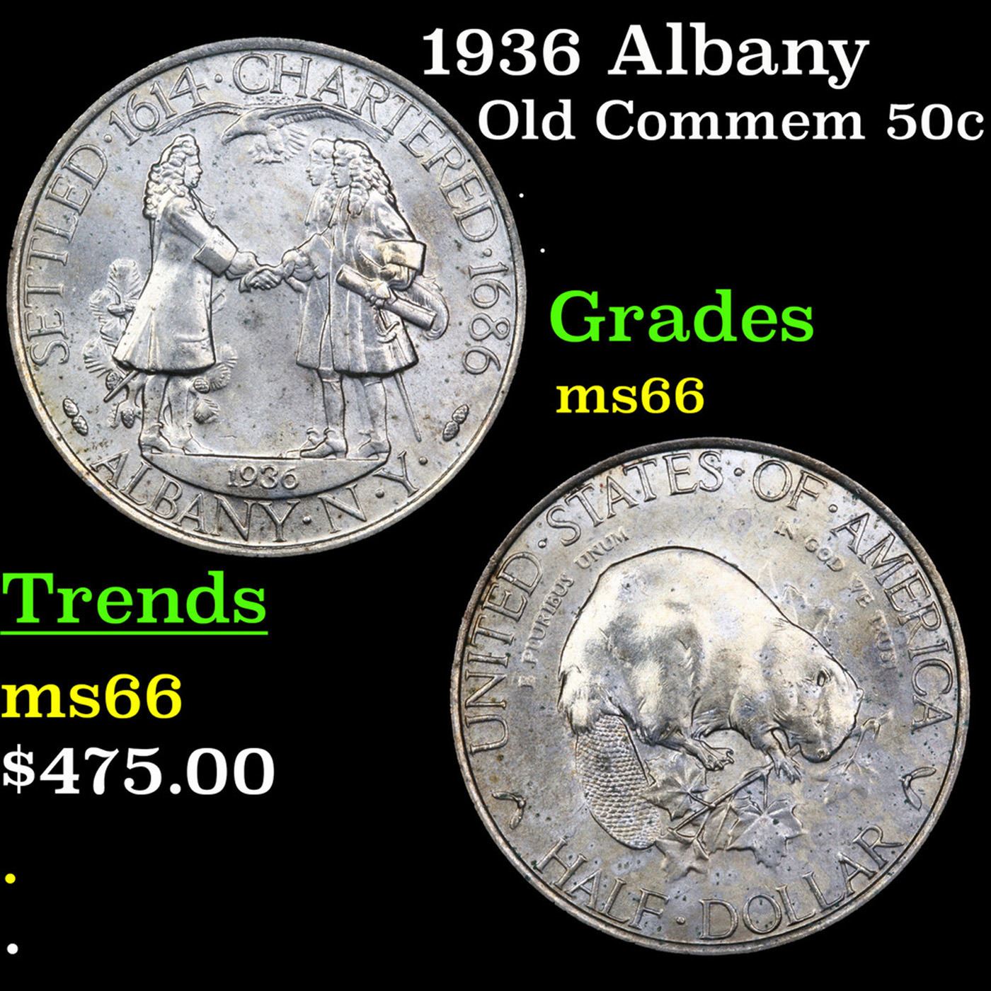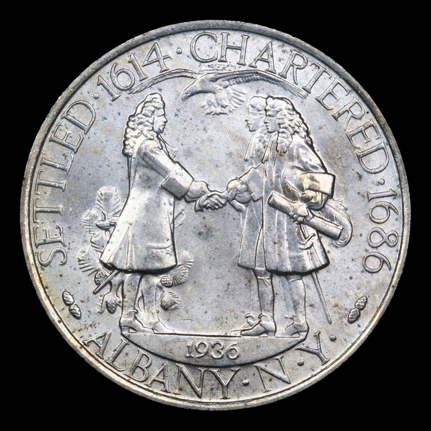 1936 Albany Old Commem Half Dollar 50c Graded ms66 BY SEGS. Another local anniversary was celebrated with the issuance of a commemorative coin. The 1936 Albany Half Dollar was issued to mark the 250th anniversary that a charter was granted to the city of Albany, New York.The designs for the coin are viewed favorably by collectors, particularly the obverse which features a beaver gnawing on a maple branch. The designer of the coin Gertrude Lathrop had a live beaver in her studio at the time the coin was being designed. The reverse of the Albany Half Dollar depicts Colonial Governor Sir Thomas Dongan presenting a charter to Peter Schuyler, Albany’s first mayor, and Robert Livingston. An eagle in flight appears above the scene. Despite a request for a maximum authorized mintage of 10,000 pieces, the legislation set the issue at 25,000 pieces, which were all struck at the Philadelphia Mint. The coins were distributed by the Albany Dongan Charter Coin Committee for $2 each. At the time the coins were being released, the public’s enthusiasm for commemorative coin issues had faded, amidst the flood of new issues and certain abuses of the program. Sales progressed more slowly than expected and remained on sale for more than six years. At this point, the remaining quantity was returned for melting. The net distribution for the issue was 17,671.