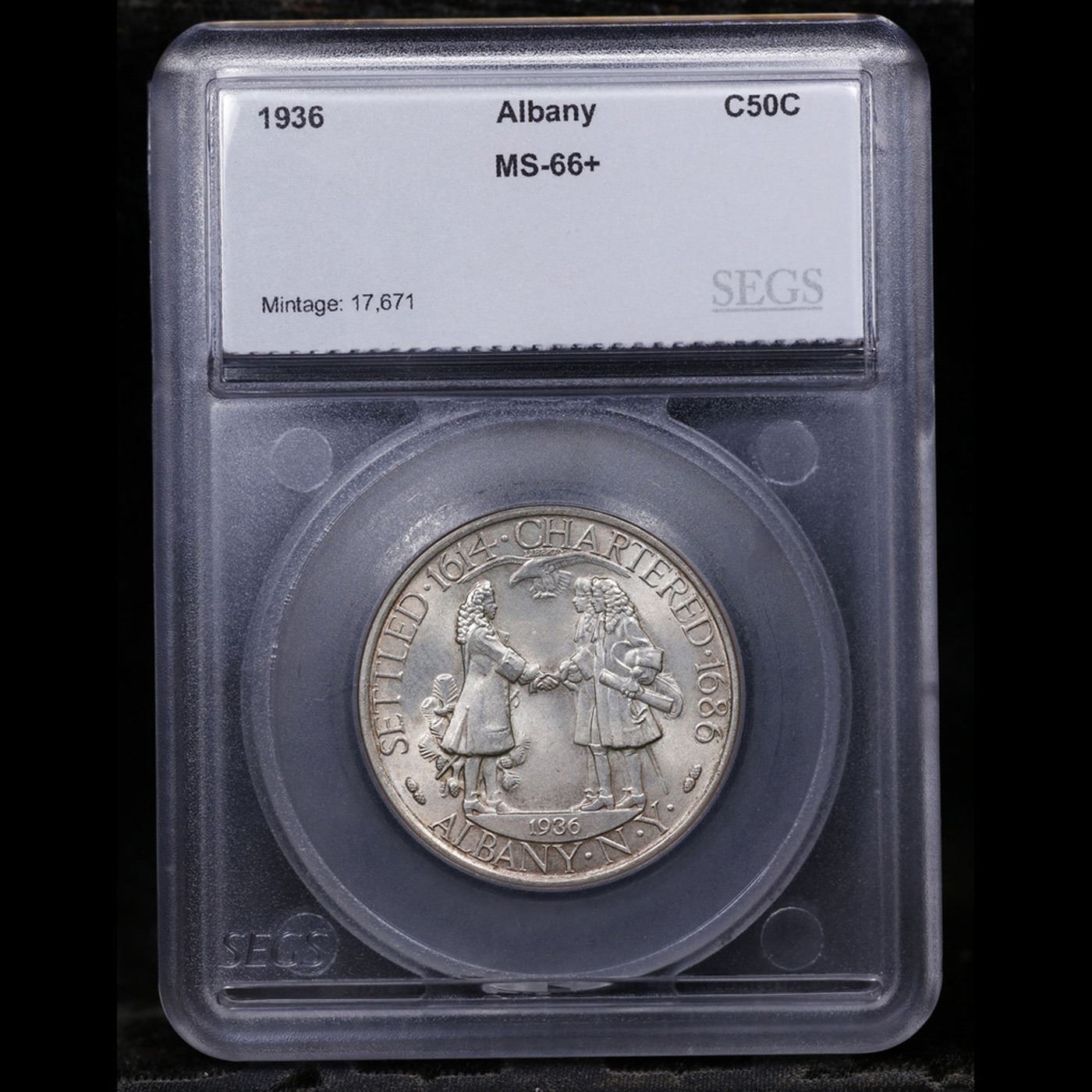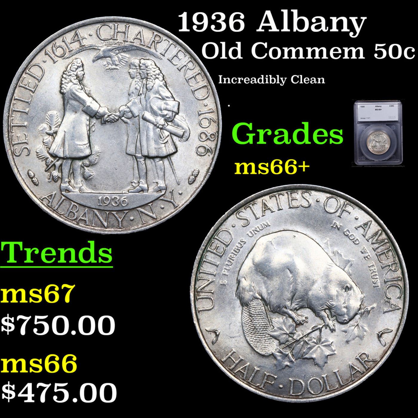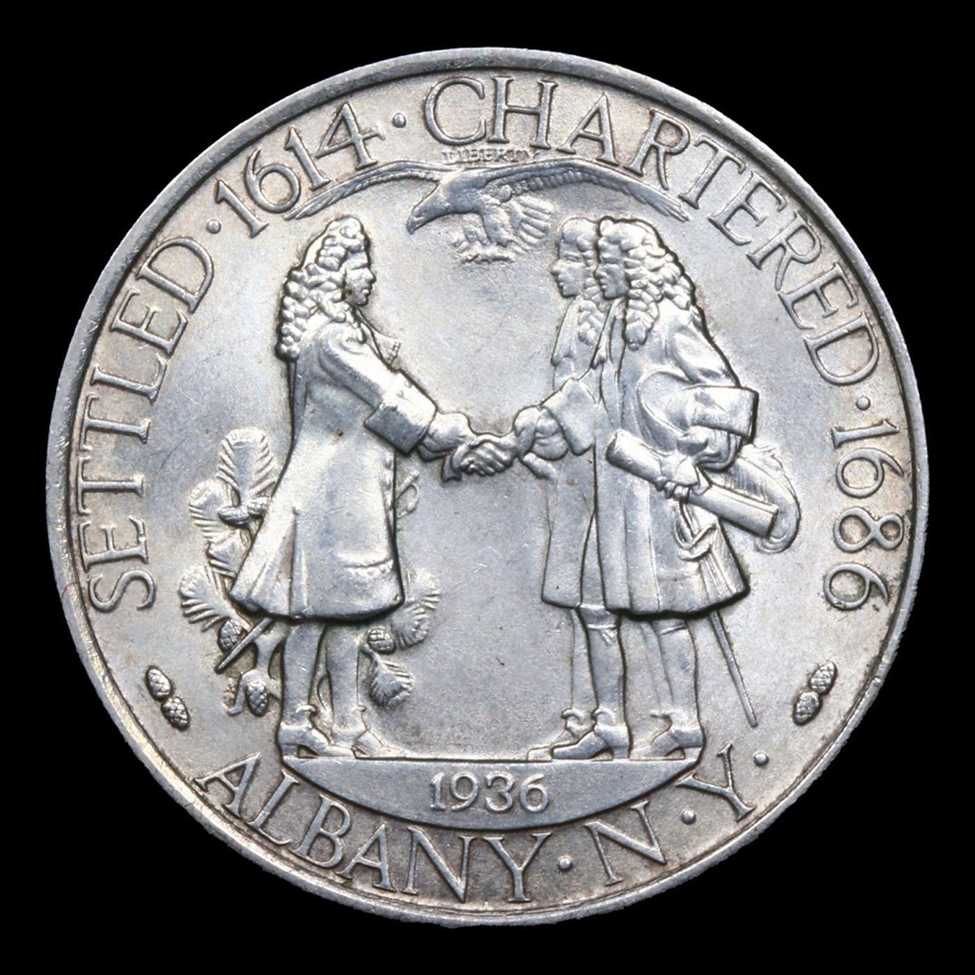 1936 Albany Old Commem Half Dollar 50c Graded ms66+ BY SEGS. Another local anniversary was celebrated with the issuance of a commemorative coin. The 1936 Albany Half Dollar was issued to mark the 250th anniversary that a charter was granted to the city of Albany, New York.The designs for the coin are viewed favorably by collectors, particularly the obverse which features a beaver gnawing on a maple branch. The designer of the coin Gertrude Lathrop had a live beaver in her studio at the time the coin was being designed. The reverse of the Albany Half Dollar depicts Colonial Governor Sir Thomas Dongan presenting a charter to Peter Schuyler, Albany’s first mayor, and Robert Livingston. An eagle in flight appears above the scene. Despite a request for a maximum authorized mintage of 10,000 pieces, the legislation set the issue at 25,000 pieces, which were all struck at the Philadelphia Mint. The coins were distributed by the Albany Dongan Charter Coin Committee for $2 each. At the time the coins were being released, the public’s enthusiasm for commemorative coin issues had faded, amidst the flood of new issues and certain abuses of the program. Sales progressed more slowly than expected and remained on sale for more than six years. At this point, the remaining quantity was returned for melting. The net distribution for the issue was 17,671.