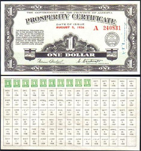 1936 Alberta Prosperity Certificate Serial Number A 240831, Very Choice AU-Uncirculated with a single strip of ten stamps affixed, otherwise Uncirculated