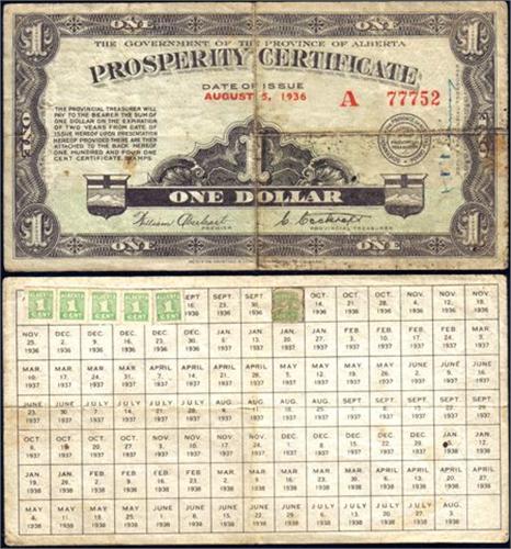1936 Alberta Prosperity Certificate Serial Number A 77752, VG with six stamps affixed