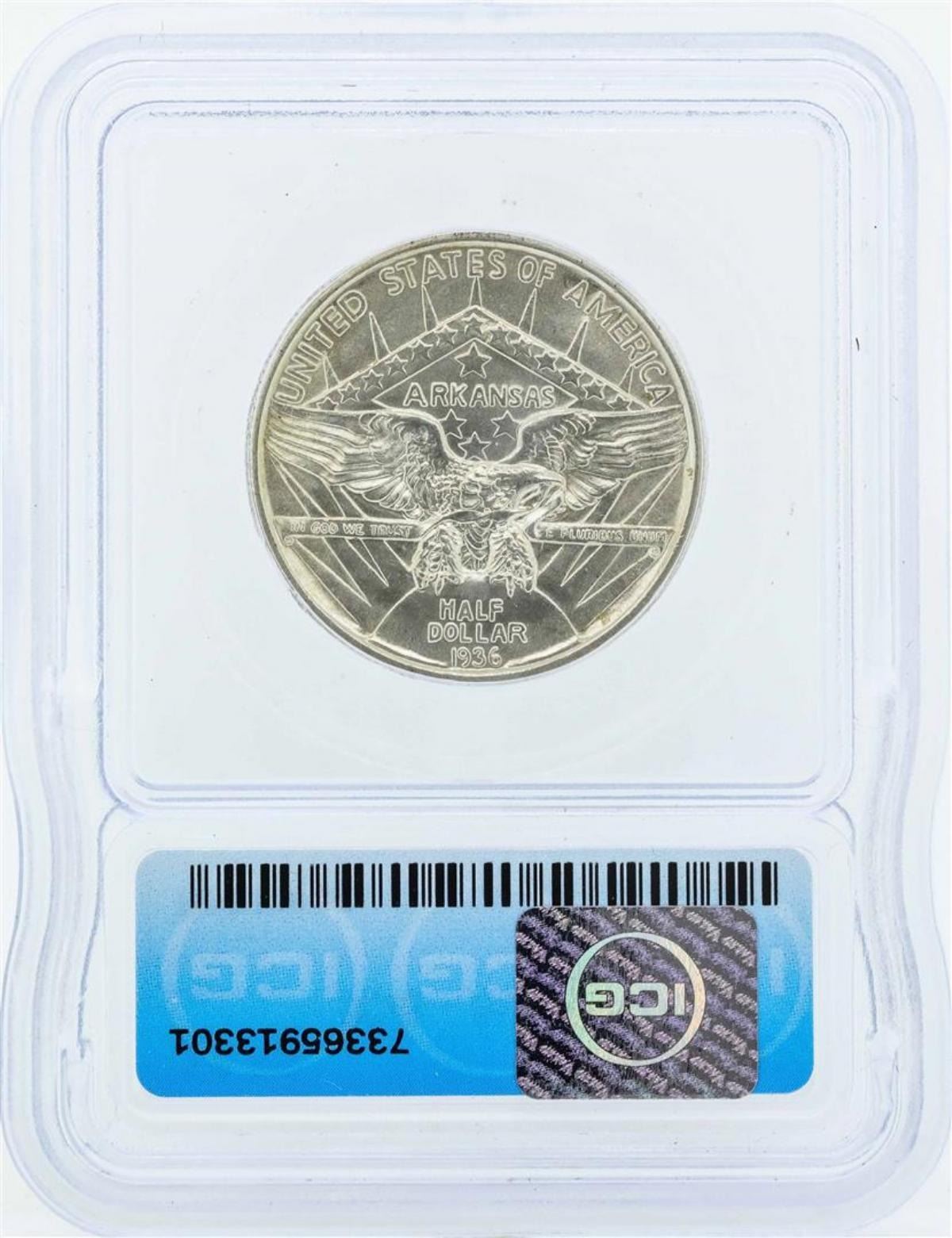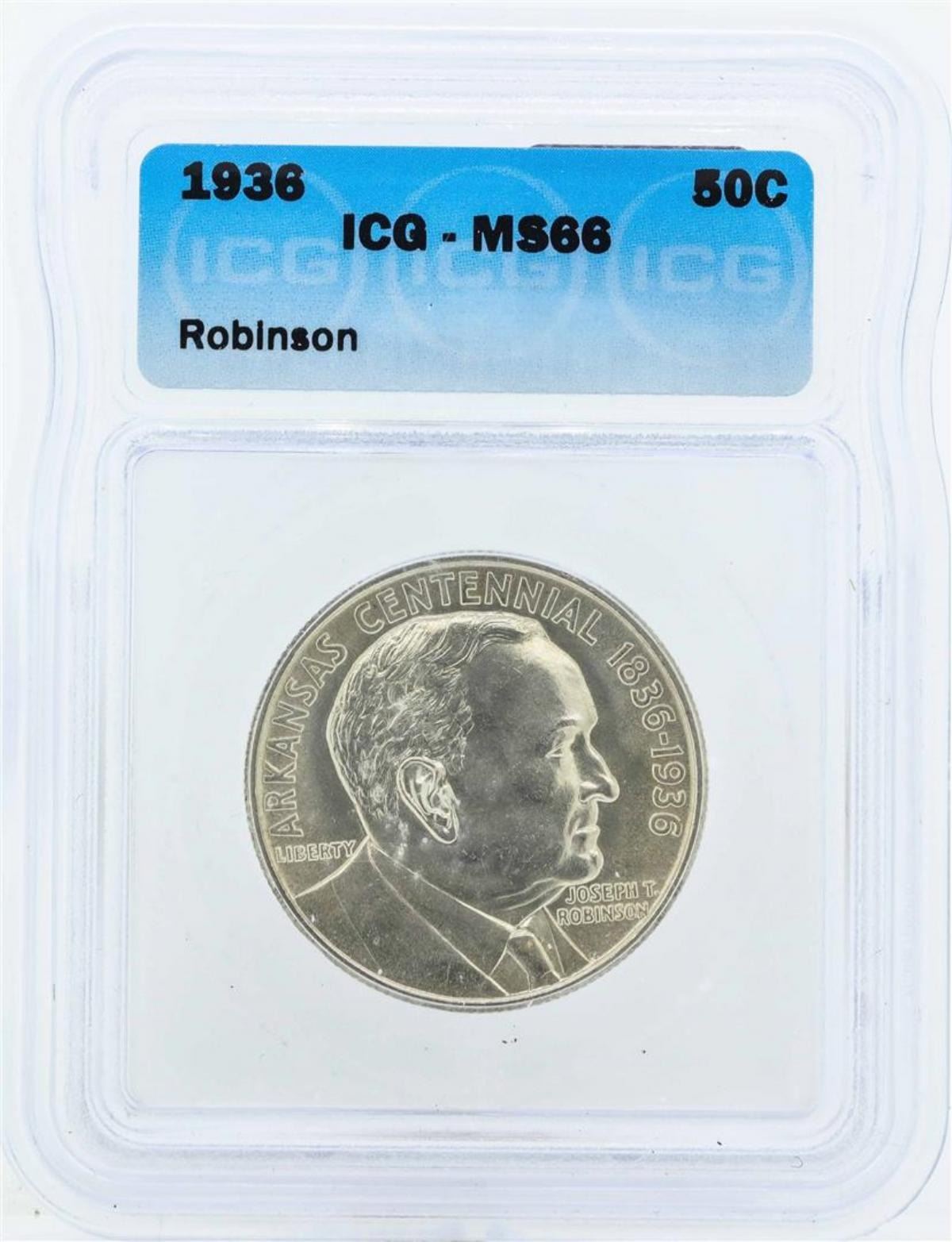 One 1936 Arkansas Centennial Robinson Commemorative Half Dollar Coin ICG MS66. ICG Appraised.