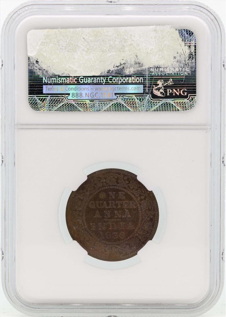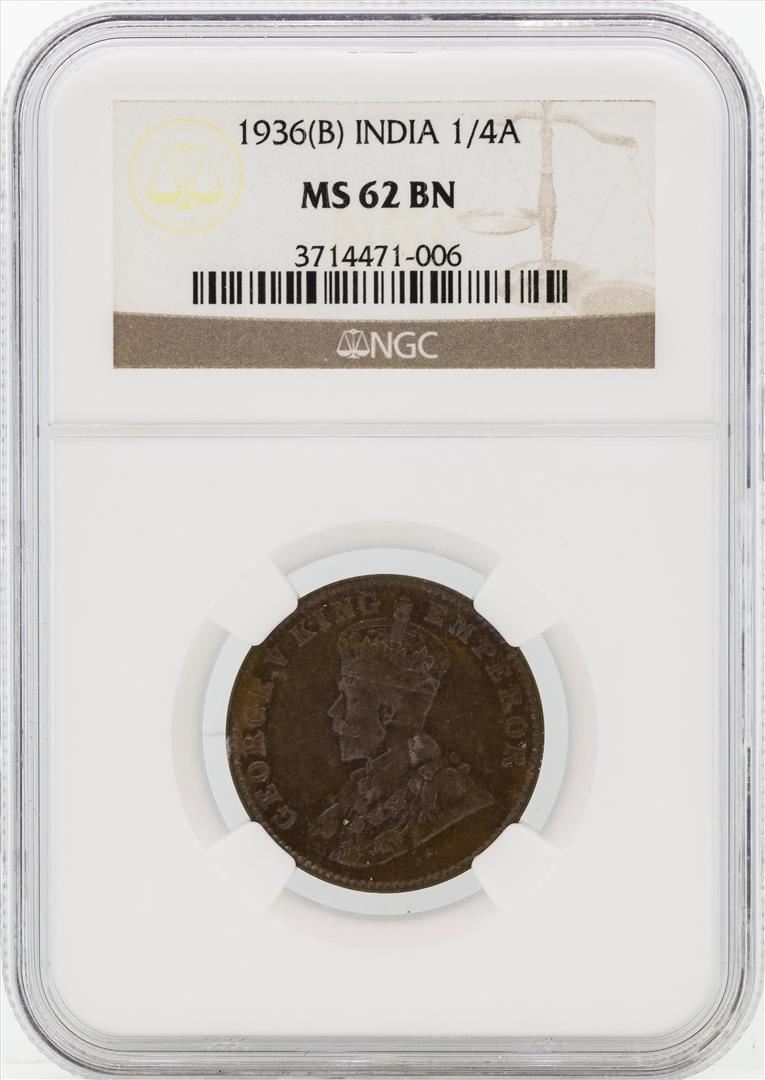 One 1936(B) India British King George V 1/4 Anna Copper Coin NGC MS62BN. NGC Certified.