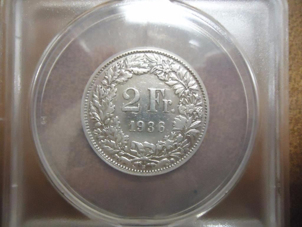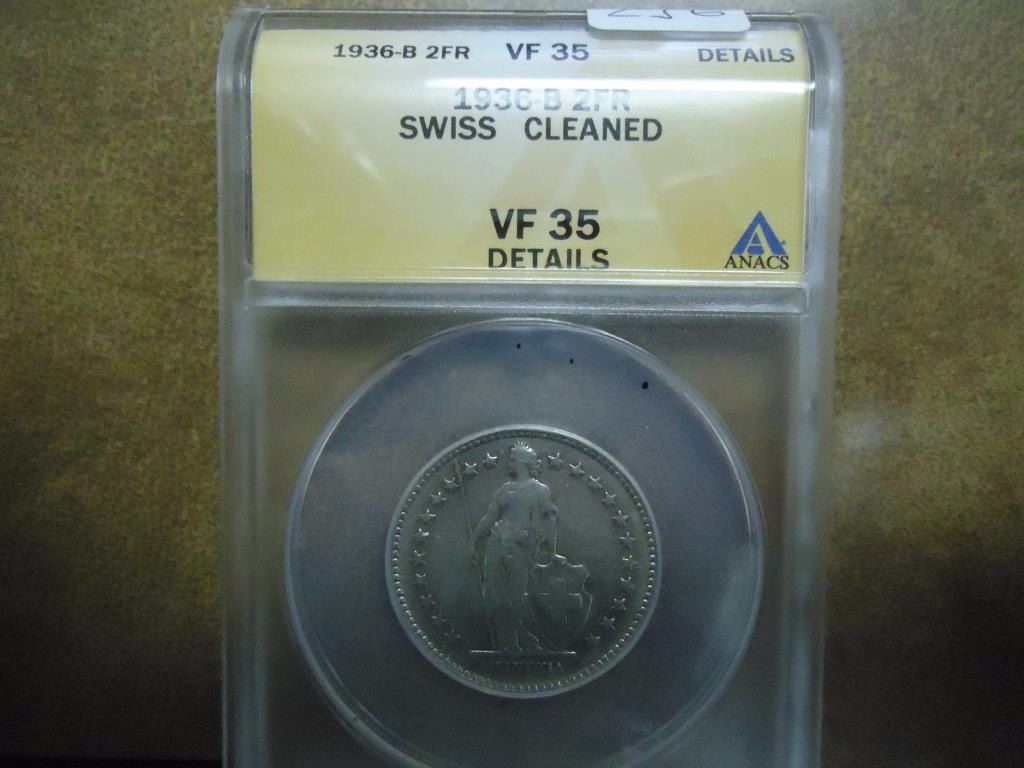 1936-B SWISS SILVER 2 FRANC ANACS VF 35 DETAILS