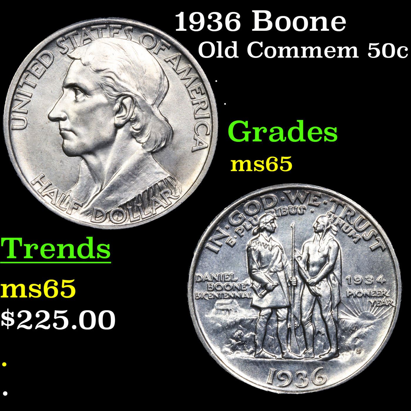 1936 Boone Old Commem Half Dollar 50c Grades GEM Unc. The Daniel Boone Half Dollar was minted to celebrate the 200th anniversary of the birth of the famous frontiersman, explorer, and folk hero. Originally, the coins were struck at the Philadelphia Mint to coincide with the bicentennial year. During the next four years, the coins would continue to be struck, across three different mint facilities.On the obverse of the coin is a portrait of Daniel Boone. Since no known portraits of him exist, this is an artists conception created by Augustus Lukeman. The likeness looks decidedly different than the portrait of Boone, which had appeared on the previous 1921 Missouri Centennial Half Dollar. The reverse of the coin features a scene of the frontiersman holding a chart of Kentucky and a musket, facing an American Indian holding a tomahawk. In the background a blockhouse stockade and a sun with rays appear. This was also designed by Augustus Lukeman. Out of the maximum authorized mintage of 600,000 coins, there were only 10,007 of the 1934 Daniel Boone Half Dollars produced and sold at a price of $1.60 each. In the following year, additional coins were struck at the Philadelphia, Denver, and San Francisco Mints carrying the 1935 date. Subsequent to the initial distribution, legislation was passed in Congress stipulating that the original design should be supplemented by adding the bicentennial year “1934” to the reverse of the coin. A smaller number of coins were minted with the “small 1934 on reverse” and came to represent a scarce variety.More coins continued to be minted and issued in 1936, 1937, and 1938. The final two years would have smaller net distribution levels as collectors began to grow weary of the endless string of varieties of the commemorative coin, issued years after the actual bicentennial.