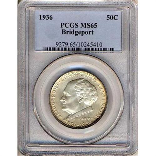 <b>1936 Bridgeport Half Dollar. PCGS graded MS65.</b> Toned. Rich silvery white color still poking through. A well struck Gem that has gleaming fields <b>(PCGS # 9279)</b> <i>