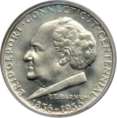 1936 Bridgeport Half Dollar. PCGS graded MS-65. Housed in an Old Green Holder and a lustrous gem. Depicts the circus man, P.T. Barnum (PCGS # 9279) .