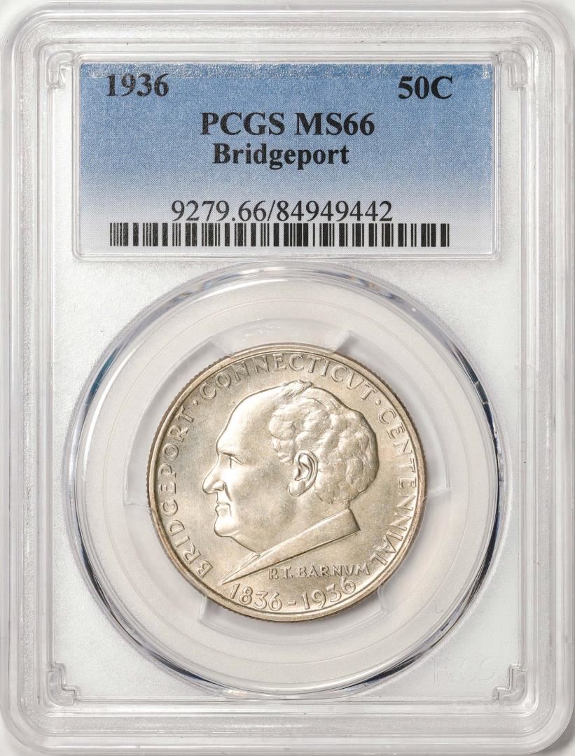 One 1936 Bridgeport Centennial Commemorative Half Dollar Coin PCGS MS66. PCGS Graded.