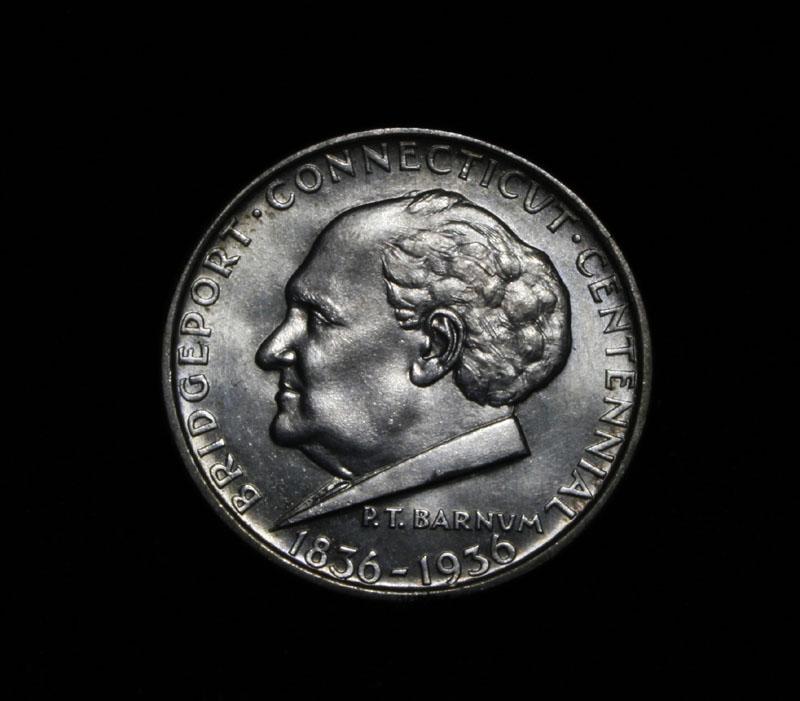 Beautiful light golden example with virtually no marks. The Bridgeport Commemorative bears the depiction of P.T. Barnum on the Obverse, having made his home in Bridgeport. Barnum was the Mayor of Bridgeport during his life. The city of Bridgeport created this coin to celebrate its centennial, but The city had actually been around since the 1600's as a major manufacturing and port city, but it was not officially incorporated until 1836. An odd Commemorative to say the least. Coin World's Coin Values lists ms65 at $300 and The Wholesale Greysheet lists ms65 at $250. Estimated Value $275