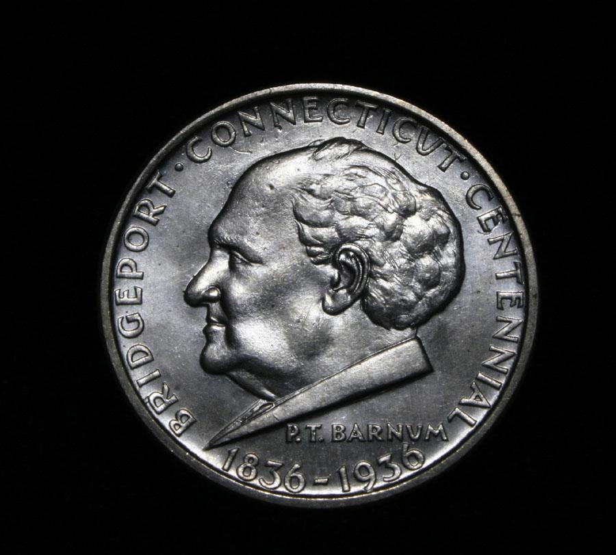 Light golden toning. Great Strike. Stunning all Original example. The Bridgeport Commemorative bears the depiction of P.T. Barnum on the Obverse, having made his home in Bridgeport. Barnum was the Mayor of Bridgeport during his life. The city of Bridgeport created this coin to celebrate its centennial, but The city had actually been around since the 1600's as a major manufacturing and port city, but it was not officially incorporated until 1836. An odd Commemorative to say the least. Coin World's Coin Values lists ms65 at $300 and The Wholesale Greysheet lists ms65 at $250. Estimated Value $275