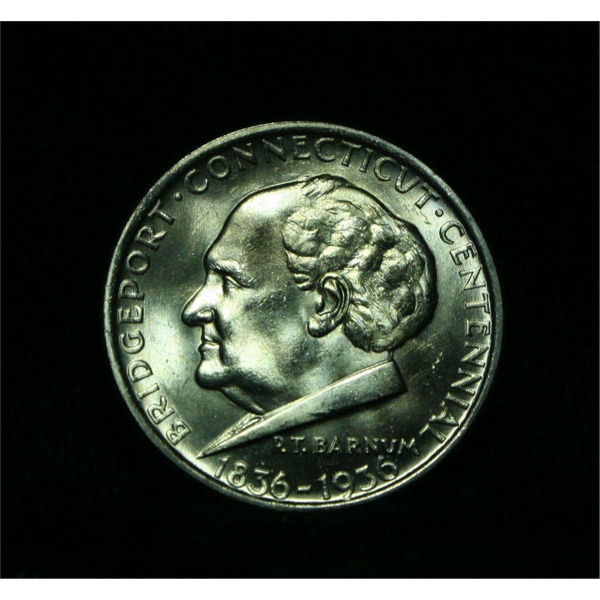 Wonderful golden toned example. Terrific eye appeal and superior luster. The Bridgeport Commemorative bears the depiction of P.T. Barnum on the Obverse, having made his home in Bridgeport. Barnum was the Mayor of Bridgeport during his life. The city of Bridgeport created this coin to celebrate its centennial, but The city had actually been around since the 1600's as a major manufacturing and port city, but it was not officially incorporated until 1836. An odd Commemorative to say the least. Coin World's Coin Values lists ms65 at $300 and The Wholesale Greysheet lists ms65 at $250. Estimated Value $275