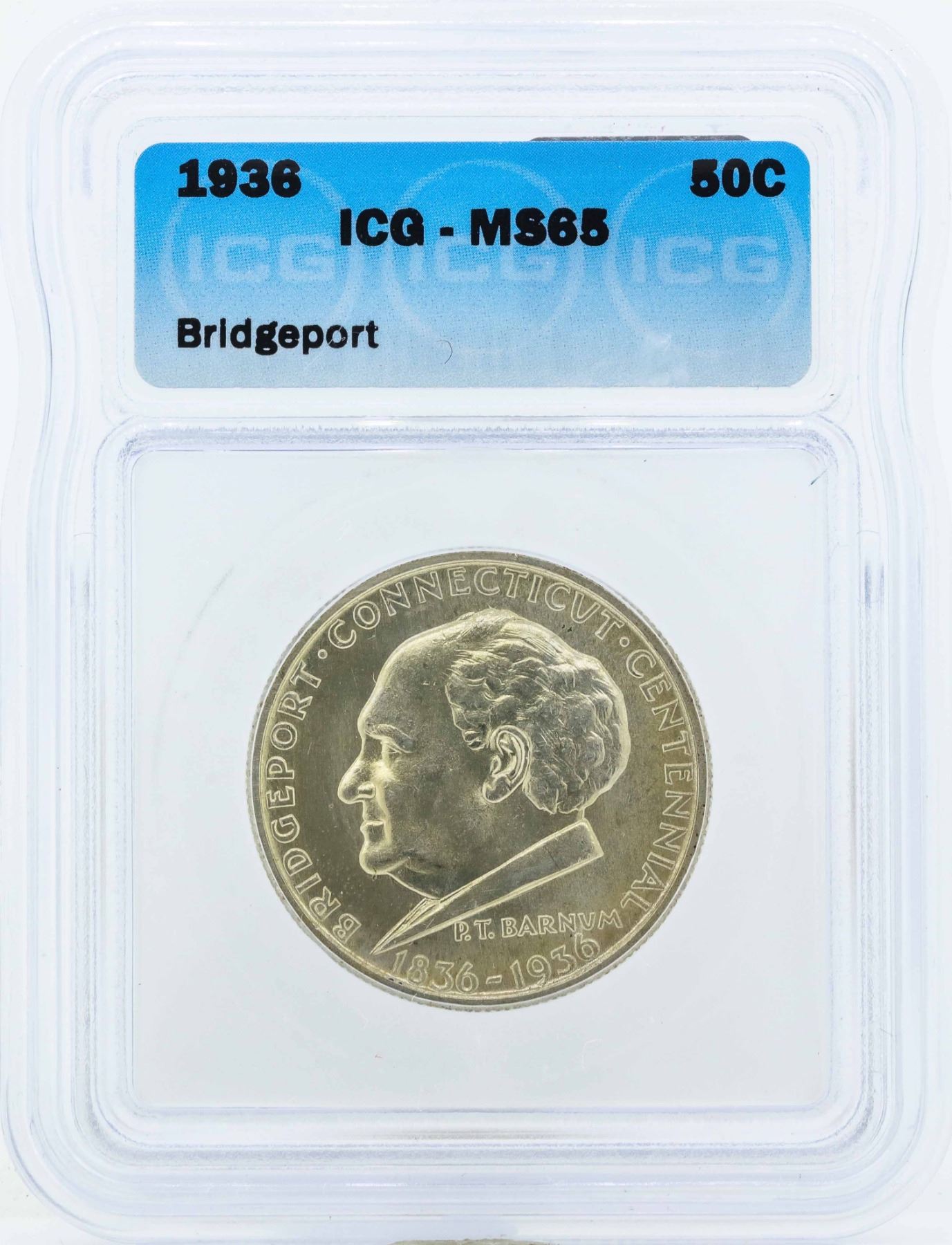 One 1936 Bridgeport Connecticut Centennial Commemorative Half Dollar Coin ICG MS65.
