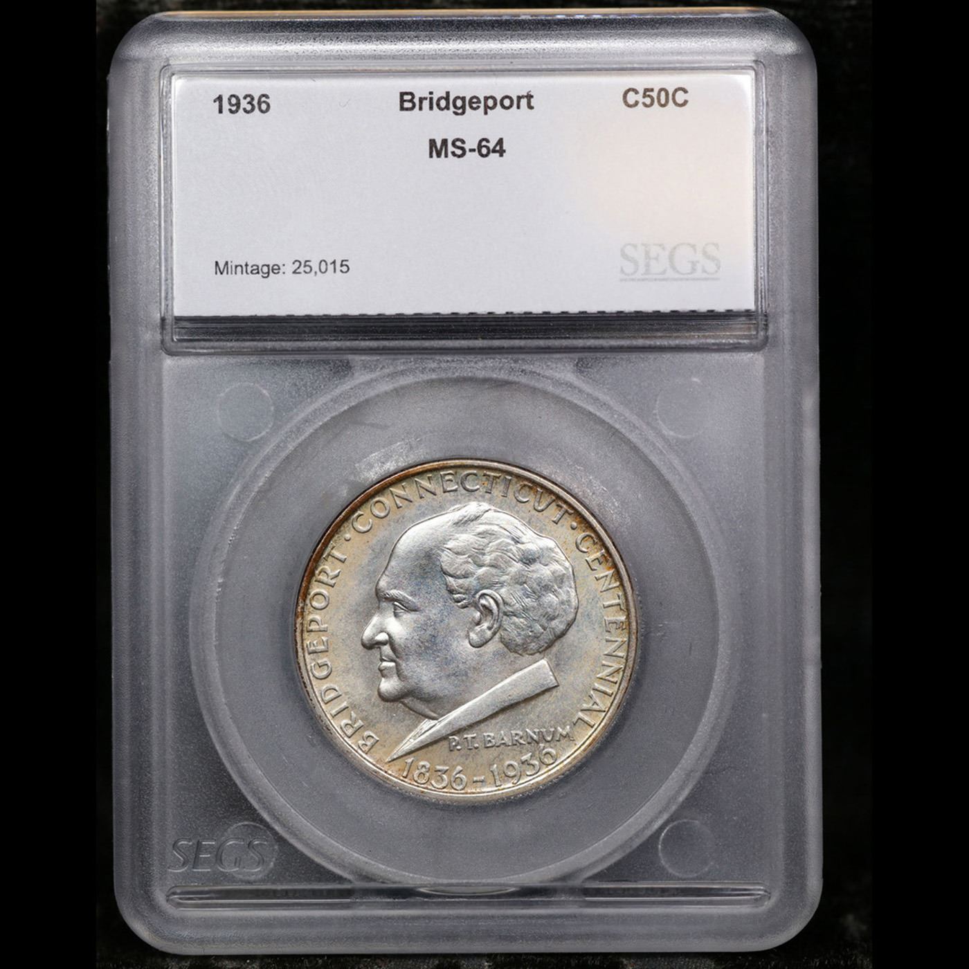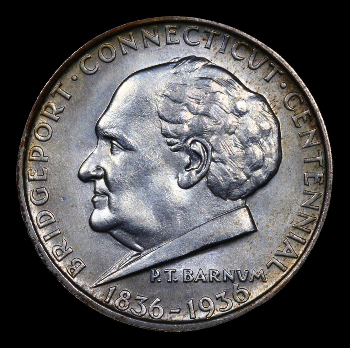 1936 Bridgeport Old Commem Half Dollar 50c Graded ms64 By SEGS. The Bridgeport Commemorative bears the depiction of P.T. Barnum on the Obverse, having made his home in Bridgeport. Barnum was the Mayor of Bridgeport during his life. The city of Bridgeport created this coin to celebrate its centennial, but The city had actually been around since the 1600's as a major manufacturing and port city, but it was not officially incorporated until 1836. An odd Commemorative to say the least. When examining a Bridgeport, the first place to look for wear is Barnum’s cheek and the eagle’s wing.