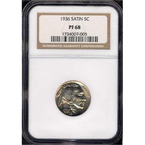 <b>1936 Buffalo Nickel. Type 1. PCGS graded Proof 68.</b> A splendid pale toned gem with forceful luster, utterly pristine originality, a confident strike, and eye appeal that just won't relinquish your attention. Watch the bidders react to this one! Proof mintage was only 4,420 pieces. You can bet your bottom dollar very few equal it <b>(PCGS # 3994)</b> <i>