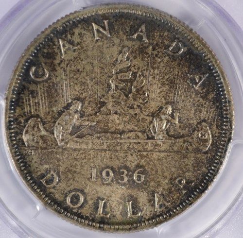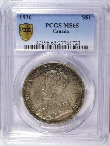 1936 CANADA SILVER DOLLAR PCGS MS65 COLOR, VERY RARE IN THIS GRADE!