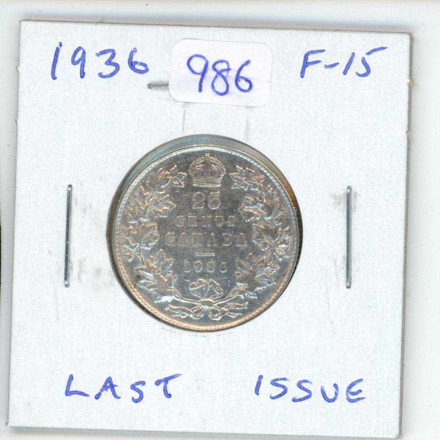 1936 Canadian Silver 25 Cents. The last issue of George V. F-15.