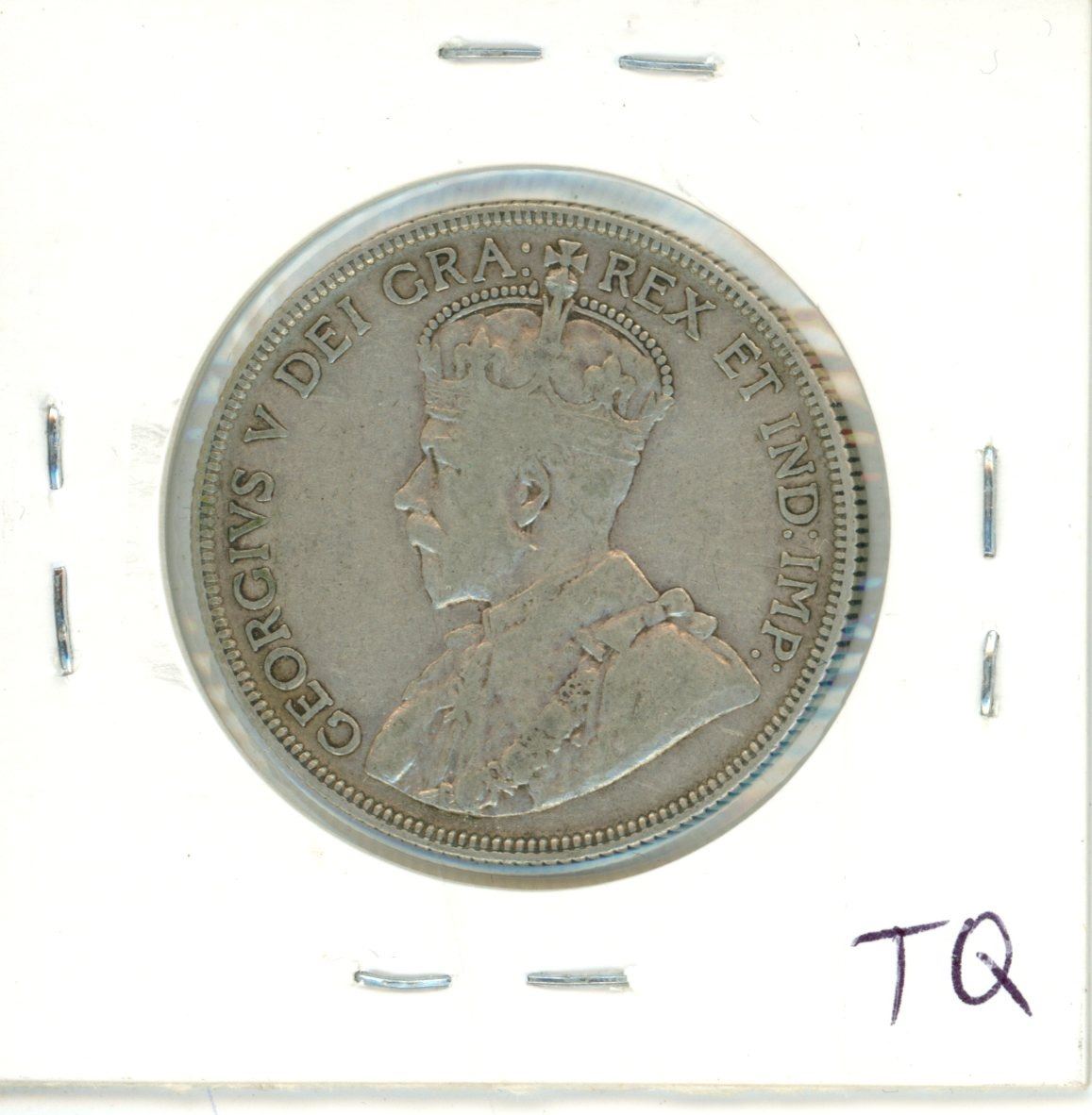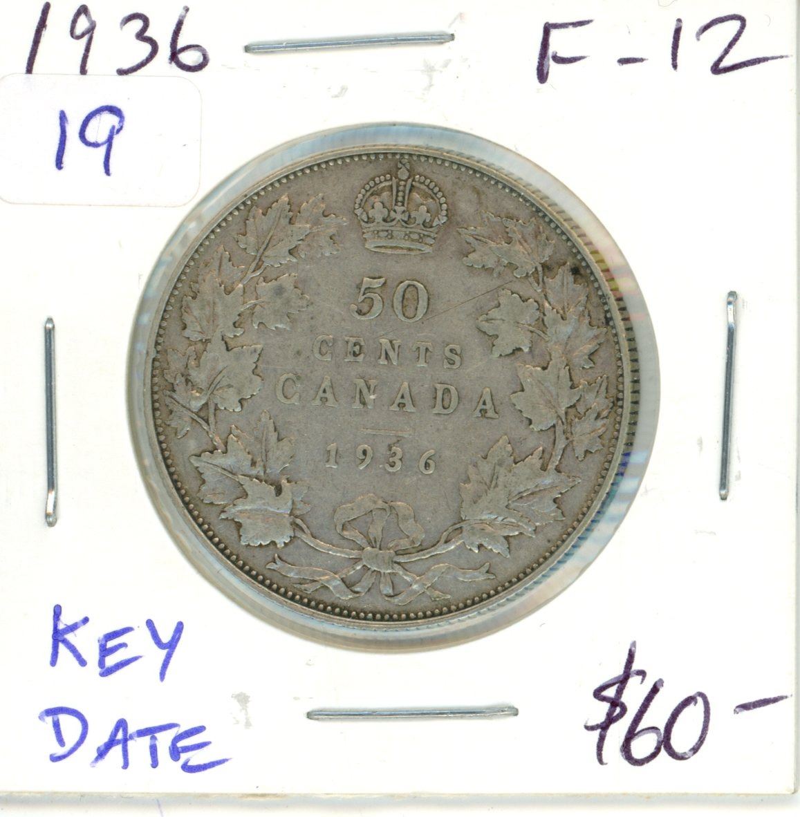 1936 Canadian Silver 50 Cents. The last issue of King George V. F-12. Key Date.